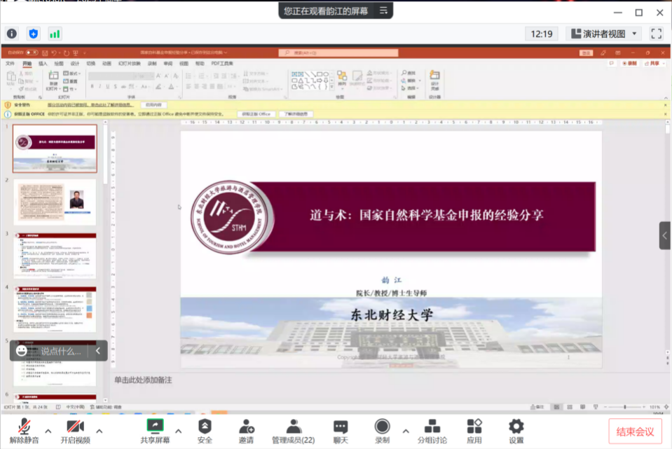 为切实提高我院教师国家级课题的选题及申报书撰写质量,提升我院教师的科研能力水平,2023年2月18日上午召开了国家级课题选题及申报书撰写线上指导会,特邀了东北财经大学旅游与酒店管理学院院长、博士生导师韵江教授为我院教师课题申报作指导,学院汤礼莎副院长和青年博士老师参加了此次指导会,会议由王朝晖副院长主持。
