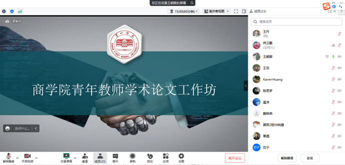 为进一步提高优秀青年教师的科研能力与学术水平,加快培养适应“双一流”建设目标的高素质师资队伍,推动高水平科研与高质量教学相互促进,我院于5月23日举行青年教师学术论文工作坊(第一期)活动。本次活动特邀上海财经大学期刊社责任编辑、《外国经济与管理》编辑部副主任王孜博士,伟德国际1946学报编辑部钟佩君主任,商学院郑准教授担任点评嘉宾,由王朝晖副院长主持,部分青年教师全程参与。