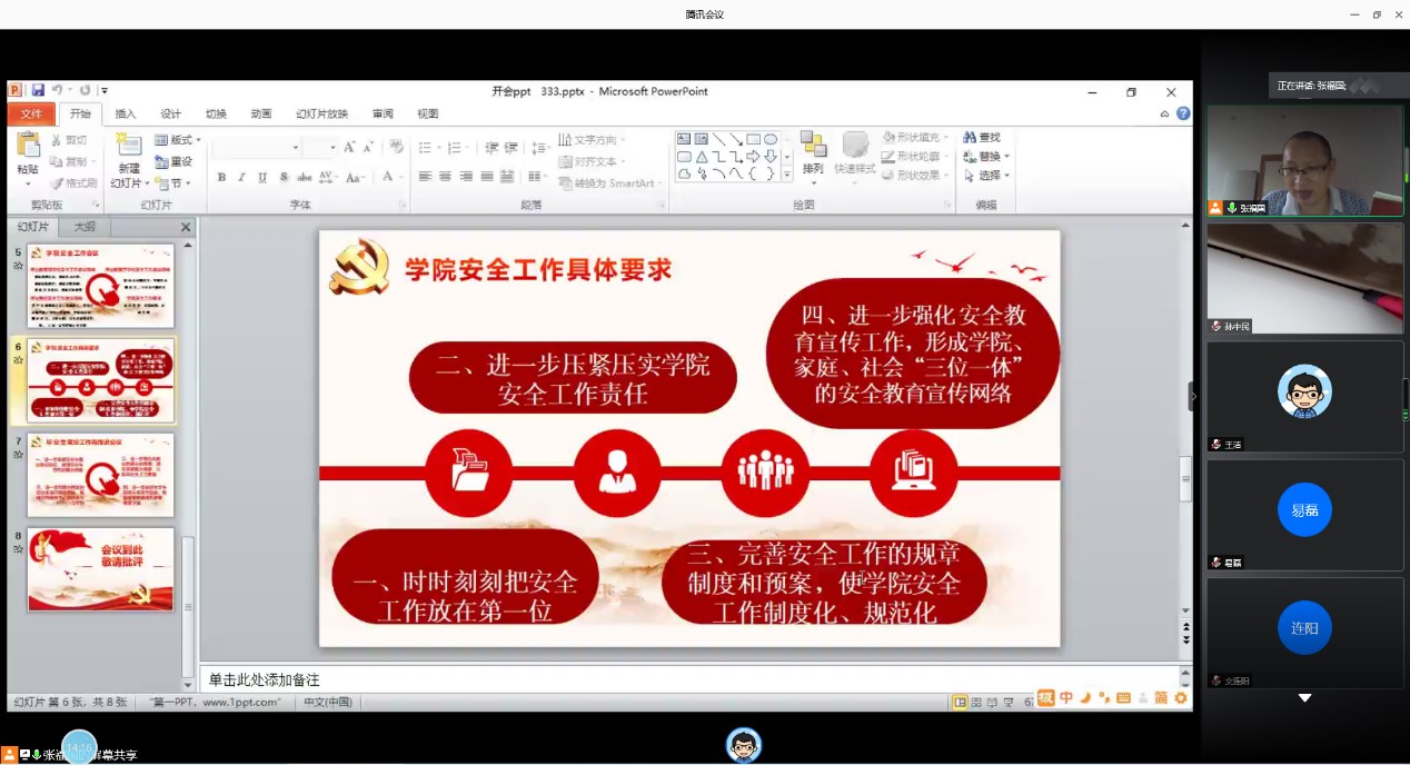 张福国传达了教育部、教育厅、我校安全工作会议精神;要求各支部、教研室、办公室在工作上要时时刻刻把安全工作放在第一位,进一步压紧压实学院安全工作责任,完善安全工作的规章制度和预案,使学院安全工作制度化、规范化,进一步强化安全教育宣传工作,形成学院、家庭、社会“三位一体”的安全教育宣传网络。