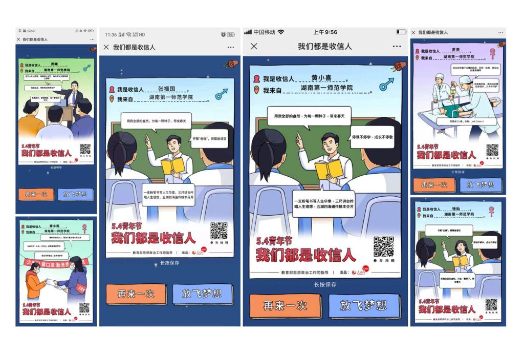 “我们都是收信人”五四主题根据职业划分成了科研工作者、人民战士、人民教师、大国工匠、医务工作者等多个话题模块,激发青年热情,明确青年梦想、指明青年追梦方向。广大师生积极响应,纷纷于微信、微博平台上参与小程序活动,表明身份,书写理想,放飞梦想。