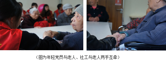 活动中,年轻人们身穿志愿者马甲,胸前戴着红色的党徽;老人们则多数坐在轮椅上,头发花白,却仍旧精神十足地说着自己年轻时的故事。