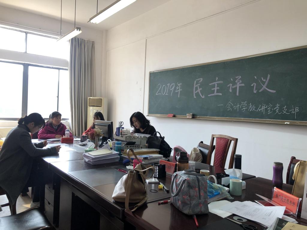 2019年12月10日下午,商学院会计学教研室支部开展“2019年民主评议”。姜美书记首先对会计学教研室党支部成立以来的支部工作做了全面系统的总结与汇报,重点回顾了“不忘初心、牢记使命”主体教育活动的基本情况和“三会一课”的基本内容,并且汇报了支部成立以来取得的成绩和存在的不足。