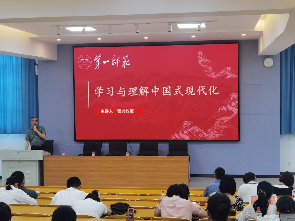 曹兴副校长以《学习和理解中国式现代化》为题,阐述了中国式现代化的发展历程和逻辑关系,阐明了中国式现代化的本质要求、中国特色、重大原则,提出如何推进现代化建设,为全体党员教师讲了一堂生动的党课。他指出,我们推进的现代化,是中国共产党领导的社会主义现代化,必须坚持以中国式现代化全面推进中华民族伟大复兴,坚持把国家和民族发展放在自己力量的基点上、把中国发展进步的命运牢牢掌握在自己手中。我们以中国式现代化全面推进中华民族伟大复兴,这既是路径,也是目标,也是方向。