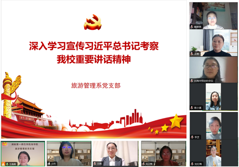 3月28日,旅游管理系党支部召开了线上会议,深入贯彻学习习近平总书记在我校考察时的重要讲话精神。会议由党支部书记彭小舟主持,组织委员王晶圆、纪检委员刘卫梅、全系党员老师参加了此次会议。