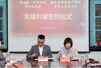 在全场热烈的掌声中,湖南第一师范商学院党委与湖南财信资产管理有限公司党总支举行了庄重的党建共建签约仪式。此次签约标志着双方将在党建工作上开展深度合作,通过将党建工作与诚信理念深度融合,充分发挥校企双方优势,实现党建资源共享、社会责任共担。未来,双方将围绕课程实践建设、人才培养、社会服务等方面展开全方位合作,共同为湖南“三高四新”战略贡献力量。