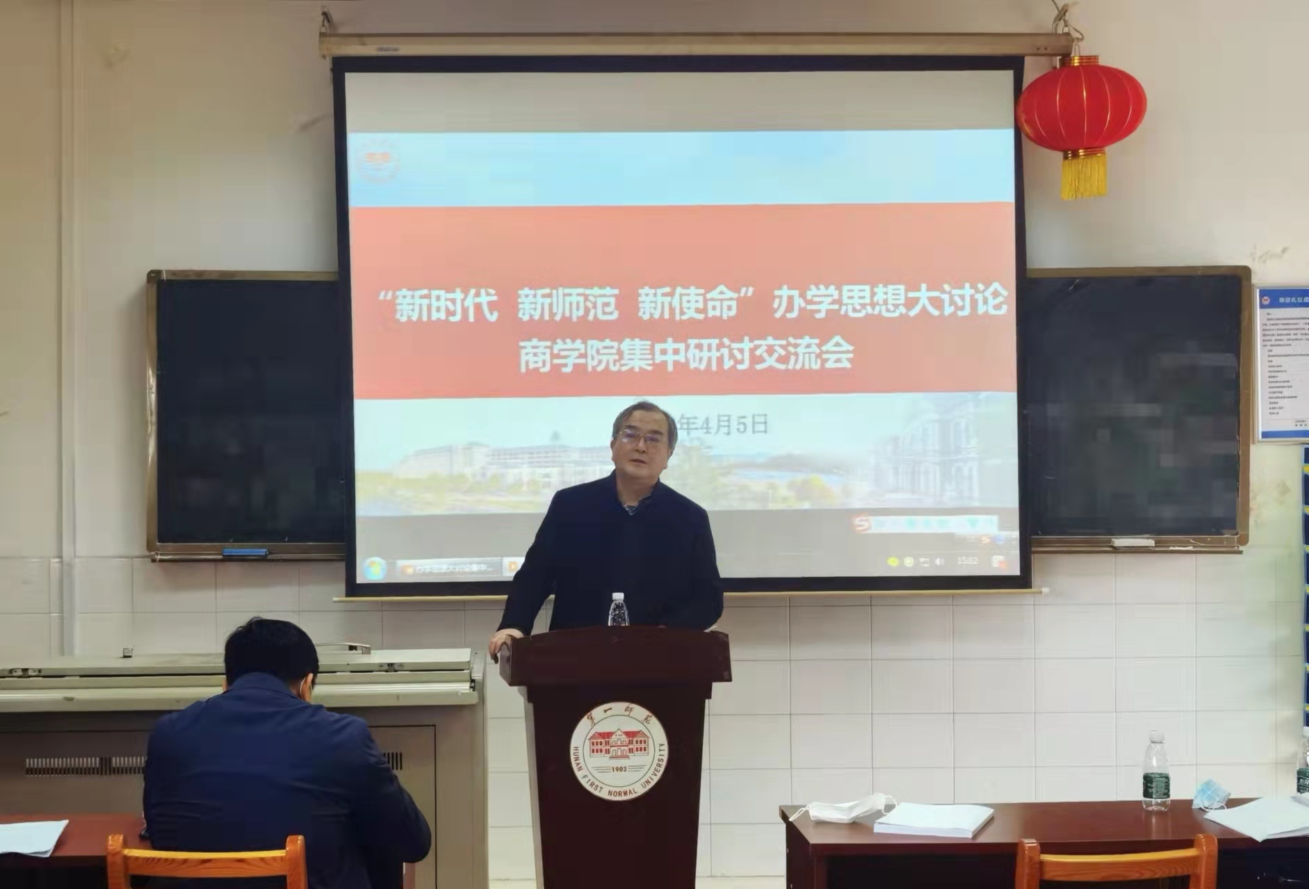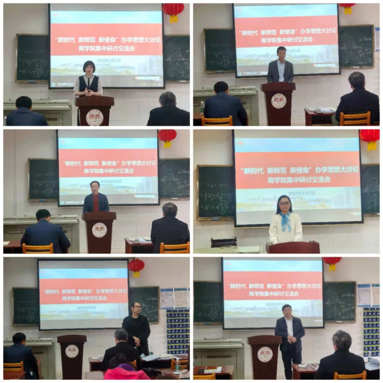 2022年4月5日下午,商学院在玉衡南604组织全体教职员工召开“新时代 新师范 新使命”办学思想大讨论集体研讨会。校党委委员、副校长曹兴参会,科研处处长黄小喜,学科建设处处长欧阳章东、副处长殷章馨列席会议,会议由学院党委书记邓剑主持。