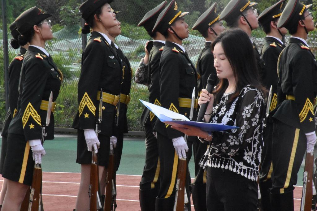 迎着朝阳,国旗护卫队的旗手们在全体师生注目下迈着整齐步伐,护送五星红旗走向升旗台。全体师生庄严肃穆,齐唱国歌,注视国旗冉冉升起。