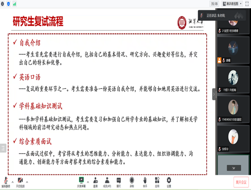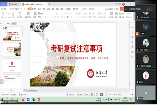 2023年3月16日上午,商学院举办线上考研复试辅导讲座,湘潭大学商学院副院长朱健教授为考研同学做考研复试辅导。商学院党委副书记李辉华、团委书记龚曦以及2023年考研同学参加讲座。