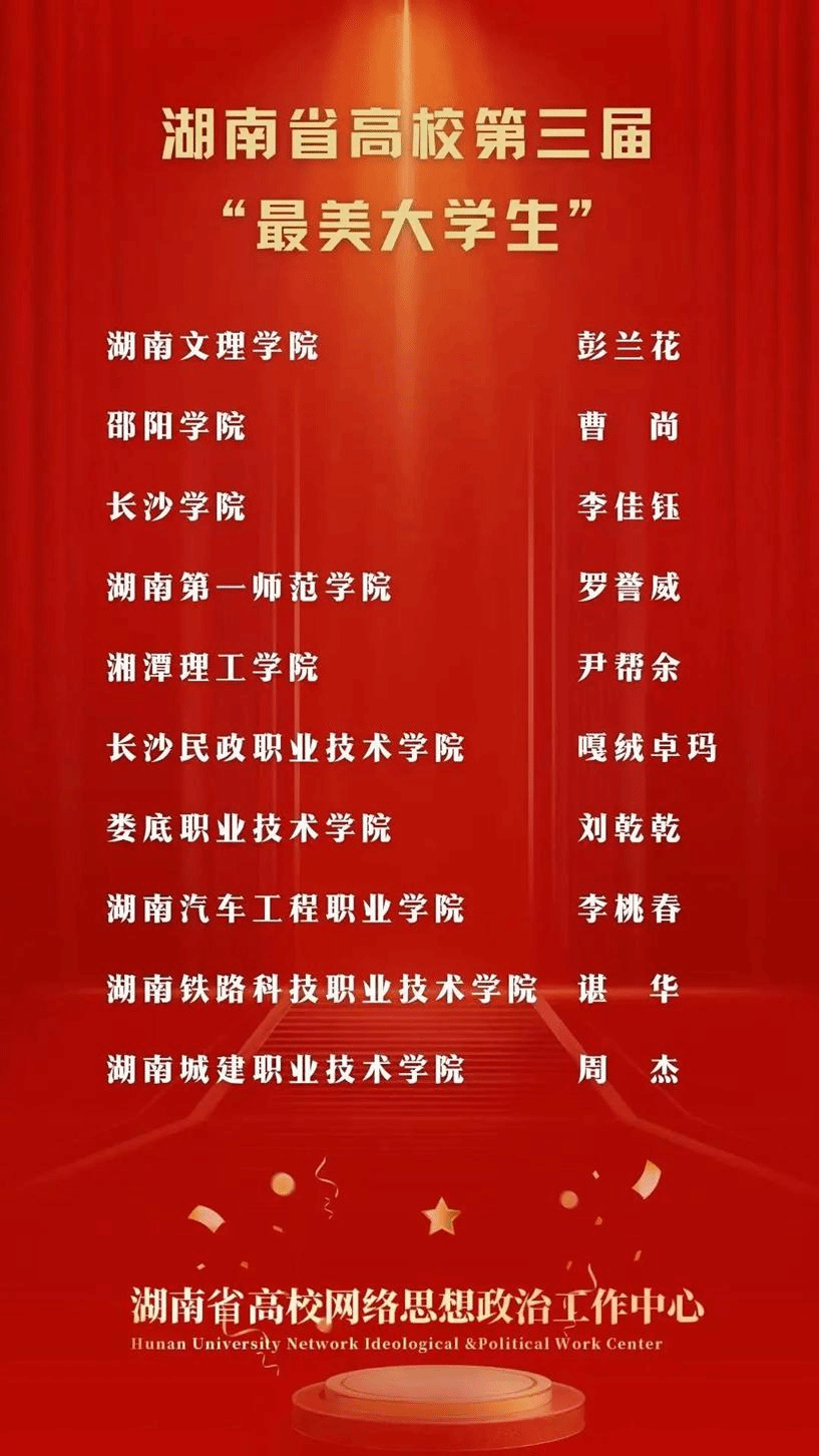 为深入学习贯彻习近平新时代中国特色社会主义思想,大力培养选树新时代高校思政工作队伍和大学生先进典型,加快推进“时代新人铸魂工作”落实落地,省委宣传部、省委教育工委、省教育厅联合开展了湖南省高校第三届最美思政课教师、最美辅导员、最美大学生推选活动。经高校推荐、资格审核、专家评审、结果公示,共推选10名最美思政课教师、10名最美辅导员、20名最美大学生。热烈祝贺我院学子罗誉威获得湖南省高校第三届“最美大学生”荣誉称号。