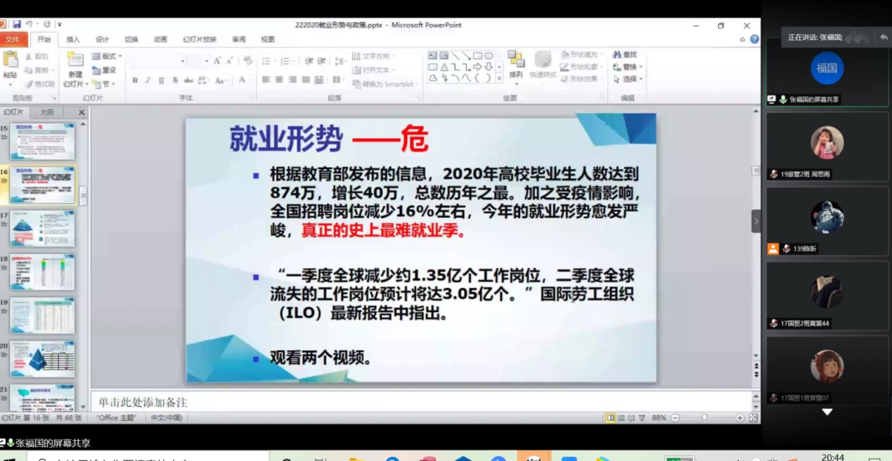 此次线上就业指导系列讲座,帮助同学们了解就业形势和就业政策、树立正确的就业观念、提高求职面试技能,向我院2021届毕业生发起了就业动员。讲座得到了老师和同学的高度认可,取得了预期效果。学院将坚持把大学生就业工作作为学院的首要工作,进一步拓展实习就业渠道,加强就业指导,奋力做好大学生就业工作,实现立德树人目标。