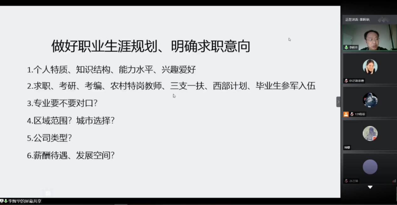 就业是民生之本,是国家发展的基石。党中央国务院提出“六保”“六稳”,放在第一位的就是保就业、稳就业。我院高度重视毕业生就业工作,把大学生就业工作作为学院的首要工作,学院党政一把手亲自抓毕业生就业工作。为落实国家关于加强大学生就业指导的要求,进一步提高毕业生职业能力与就业竞争力,我院于7月27日至8月1日为2021届毕业生们举办了线上就业指导系列课程讲座。院党总支书记张福国、院长黄小喜、院党总支副书记李辉华为同学们授课。
