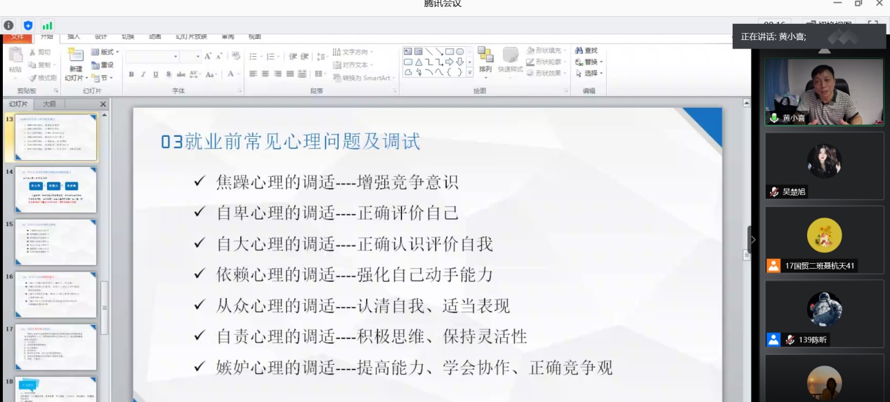 此次就业指导系列课程包括“就业形势与政策”“就业定位与准备”“求职面试与签约”三个部分。张福国书记分析了2021年大学毕业生就业形势,介绍了就业政策以及我院考研考编等情况。张福国建议同学们摆正心态,树立正确的就业观念,实事求是,抓住机遇,找到自己满意的工作。黄小喜院长从同学们就业前常见的心理问题及调试、当今社会用人标准、招聘侧重点等方面向毕业生分享了如何调整就业定位,如何进行就业准备等。李辉华副书记主要为同学们讲解了如何有效获得更多就业信息、如何制作一份优秀的简历、面试礼仪、常见面试形式和面试问答等同学们求职面试中普遍关心的问题,并提出了自己的就业建议,希望同学们抓紧做好职业生涯规划,明确求职意向,坚定理想信念,创新求职思路,整合有利资源,实现自己的就业理想。