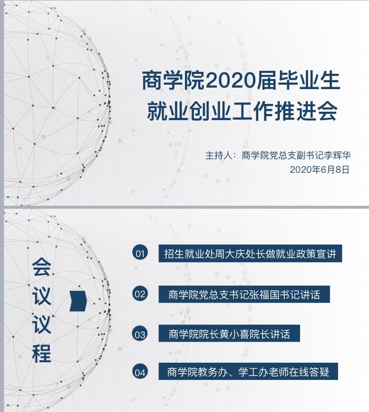 2020年6月8日,商学院(创新创业学院)以腾讯视频会议的形式召开了2020届毕业生就业创业工作推进会。学校招生就业处周大庆处长、商学院黄小喜院长、党总支书记张福国、荆龙姣副院长,教务科研办王丹老师、学工办禹晗老师、许炳娜老师以及毕业生参加了会议。会议由李辉华副书记主持。