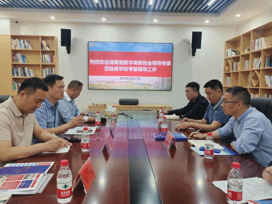 4 月 17 日下午,湖南省数字商务协会秘书长谭剑率领企业家代表团一行到访我院考察指导,开展校企共建活动,旨在深化产教融合,推动数字商务人才培养模式的创新。湖南易信科技有限公司总经理张泽、湖南东欣电子商务有限公司总经理邹海波等企业代表,与商学院院长王朝晖、党委副书记王高见及师生代表共同参与了此次座谈交流。