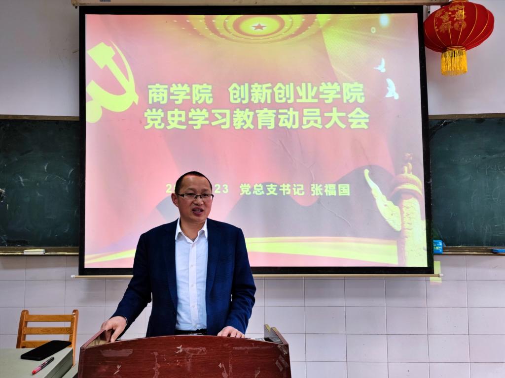 3月23日,商学院(创新创业学院)党史学习教育动员大会在玉衡南604举行。会议由党总支书记张福国主持,全体教职工党员参加了会议。