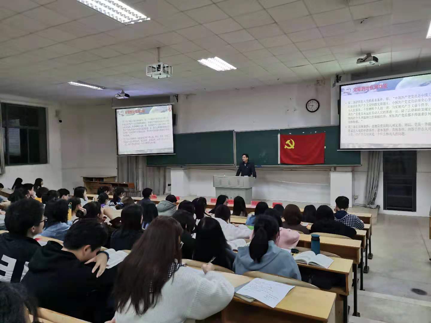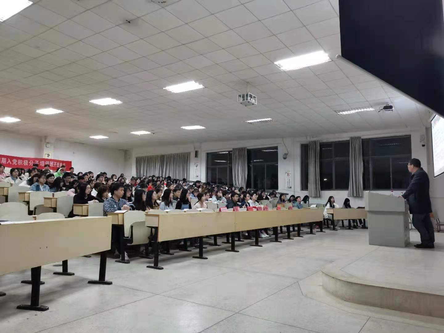 2021年4月25日晚,商学院和马克思主义学院举行了第四期入党积极分子培训开学典礼。马克思主义学院党总支书记欧阳斐、党总支副书记谢素科、副院长阮东彪、学工办主任付淑敏;商学院党总支书记张福国、学生党支部书记禹晗、学生党支部副书记冯择佳和全体入党积极分子参加典礼。