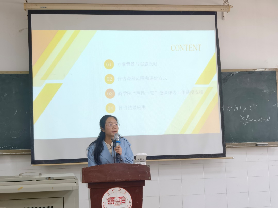 首先,教学副院长荆龙姣对“两性一度”金课实施办法进行了详细解读。传达了学校评价组织与实施时间安排及学院安排,强调各系要围绕“两性一度”开展每两周一次的常态化教研活动,并介绍了评价结果应用、奖励办法等。
