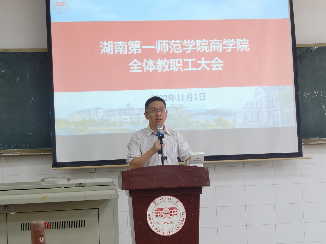 2022年11月1日,商学院组织召开全体教职工大会。大会传达了“两性一度”金课实施办法、课题申报、学生实习、班主任考核、职称申报等各项工作,并进行了学院党委委员补选投票,会议由王朝晖副院长主持。