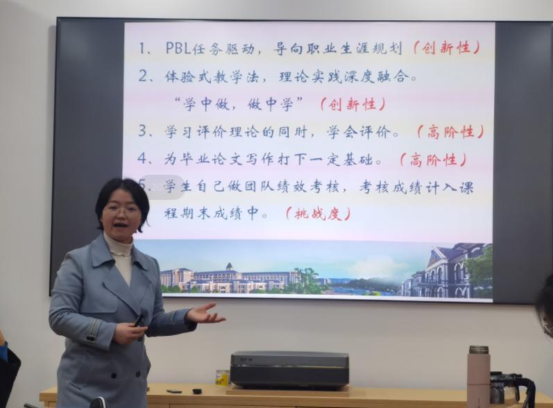 王晶圆老师的《旅游人力资源管理》这门课程注重以学生为中心,通过PBL教学方法,打造沉浸式课堂。邓文娟老师表示,王晶圆展示的学生作品质量高,教学融入了教师的思考,以学生为中心的课堂教学方式值得学习。彭小舟老师请教了PBL教学方法是如何贯穿课堂始终的问题。毛晨岚老师建议将学生作业做成一个文档。汤礼莎副院长建议可以将优秀的学生的PPT做成动图进行展示。王艳老师建议增加思政元素。