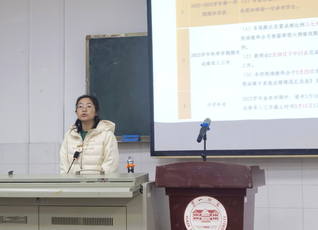 荆龙姣副院长对教学工作进行部署。一是强调上学期期末考试、补考监考工作、成绩录入、教务子系统更新。二是呼吁老师们申报教学项目,包括校级红色课程、通识课程、校级一流课程申报,线上线下混合式教学申报,教学沙龙申报等。三是准备开学第一课,要看好课表,备好课,按时到岗,熟悉设备,并关注课堂氛围。