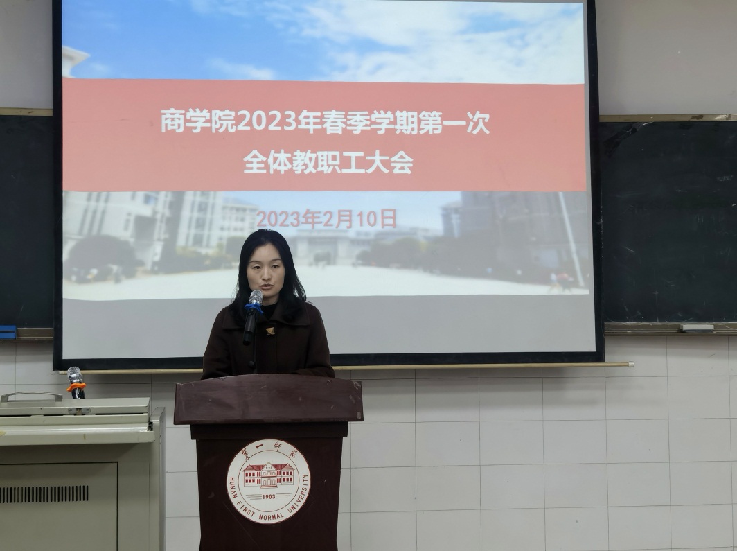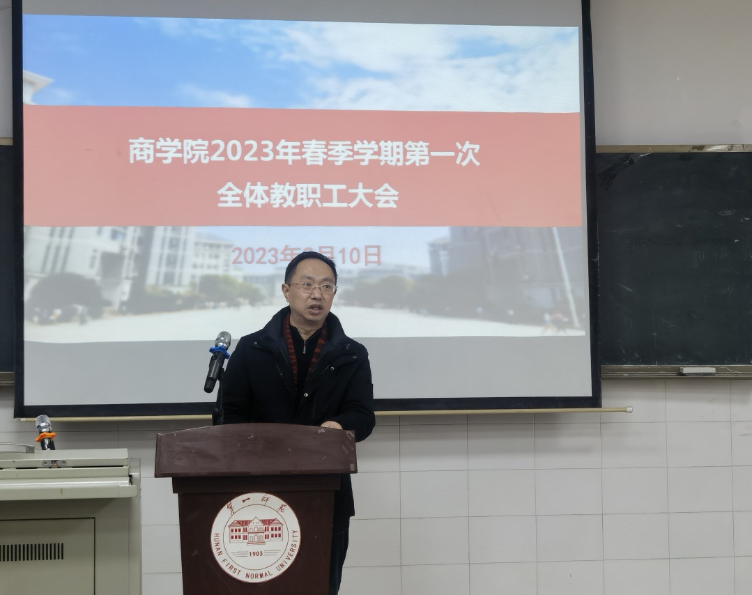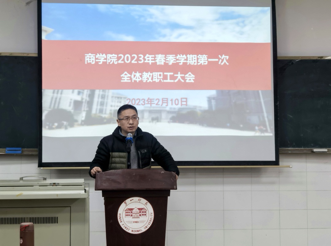 2023年2月10日,商学院在玉衡南604组织召开了春季学期第一次全体教职工大会,会议由王朝晖副院长主持。首先,王朝晖向全体老师致以新年的问候,对老师们过去一年的努力付出和所取得的成果表示衷心的感谢。同时,向大家介绍了我院国贸系新进教师郑效晨博士。学院各分管院领导对开学工作进行了部署,并传达了近期工作会议精神。