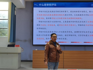教学质量监控与教师教学质量发展中心主任廖小芒教授作本科教育教学审核评估专题报告。报告系统阐述了审核评估的内涵、目标、五大原则和指标体系,重点解析了七大审核项目。廖教授详细讲解了评估材料准备要求和核心任务,并就现有人才培养方案和教学材料的问题进行分析。他强调,要以此次审核评估为契机,深化教学改革,推动学校和学院实现高质量特色发展。