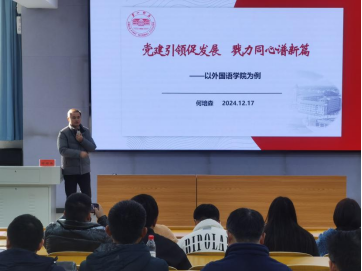 外国语学院党委书记何培森教授在会上作了题为《党建引领促发展勠力同心谱新篇》的报告。何书记从抓班子团结、建章立制、内涵建设和特色发展四个方面,阐述了外国语学院在推动党建与业务融合、促进学院规范化管理、引领高质量发展、凝心聚力支持学校改革方面的经验,并通过实例、方法和体会,为商学院党委工作提供了示范。