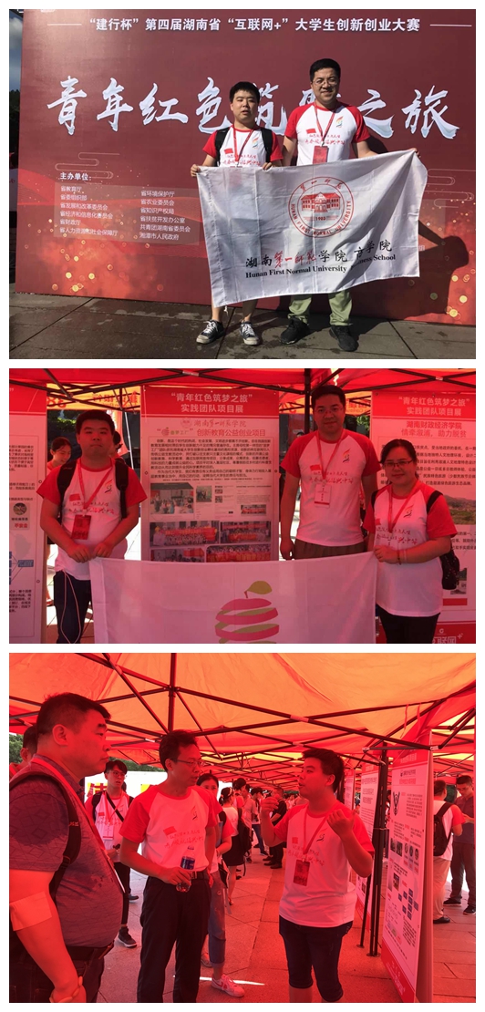 为全面贯彻习近平新时代中国特色社会主义思想和党的十九大精神,落实习近平总书记给第三届中国“互联网+”大学生创新创业大赛“青年红色筑梦之旅”的大学生的回信精神, 2018年6月26日,“建行杯”第四届湖南省“互联网+”大学生创新创业大赛“青年红色筑梦之旅”活动启动仪式在湘潭韶山市毛泽东广场举行。教育部高教司二级巡视员吴爱华,湖南省教育厅党组成员、副厅长、省委教育工委委员葛建中,湘潭市人民政府副市长刘永珍等地方政府代表出席仪式,来自全省80余所高校、130余个项目参与启动仪式。我院致力于公益创新教育的“造梦工厂”团队代表我校在活动仪式上进行展示并与湘潭市的四十个村进行扶贫项目帮扶对接。