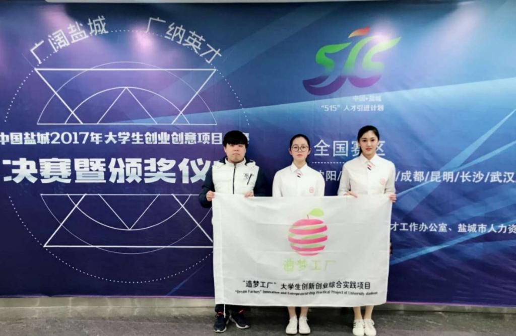 2017年11月30日,由盐城市人才工作办公室、盐城人力资源和社会保障局主办、江苏省沿海人才市场承办的中国盐城2017年大学生创业创意大赛决赛在江苏盐城市举行。由我院15级胡静、16级刘璇代表展示的造梦工厂创新教育公益创业服务平台项目在此次大赛中获得全国创业组三等奖。