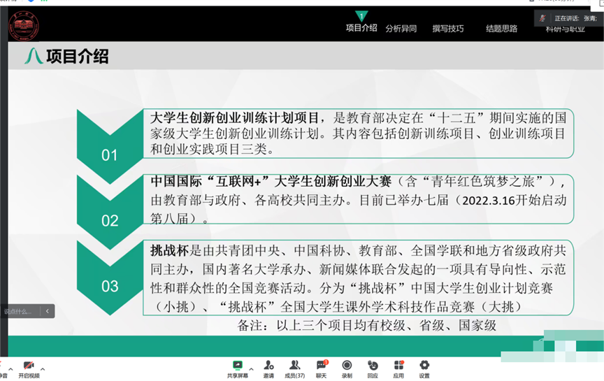 商学院创新创业专干张青老师就创新创业工作进行深入的培训。他以职业生涯与学术研究为题,以大学生创新创业训练项目为例,结合自己的经验和专业知识,给同学们带来了创新创业的新理念和新方法,使大家对创新创业工作和项目申报有了更深入的了解。