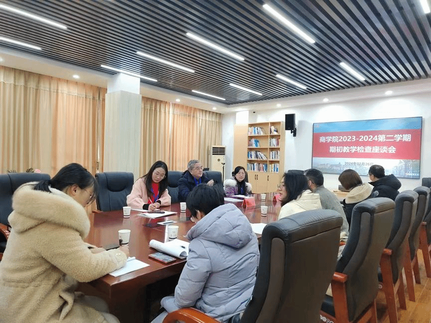 曹校长一行深入教学现场查看了教师到岗、学生到课、课堂教学秩序、教学设备设施运行等情况,随机听取了我院两位老师的课程。上午十点,座谈会在玉衡南404召开。商学院领导班子、教务办主任、系主任代表参加了座谈会。