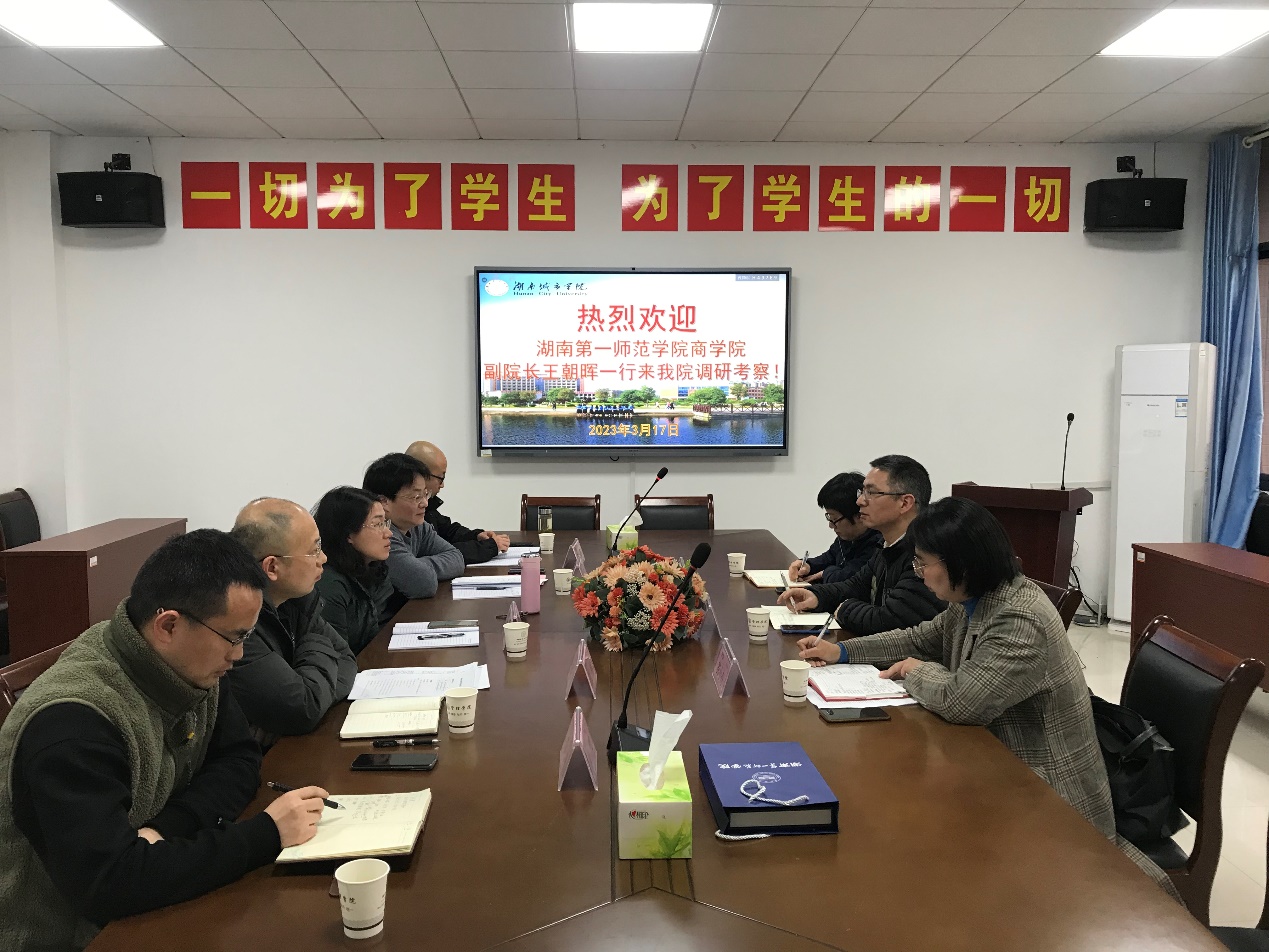 3月17日,商学院副院长王朝晖、国际经济与贸易系系主任孟娟、旅游管理系系主任彭小舟一行前往湖南城市学院管理学院进行调研和交流。湖南城市学院管理学院党委书记王正安、院长孙倩、副院长任国平、副院长刘刚、经济财务系系主任封彦、旅游管理系系主任尹罡参与此次调研交流。