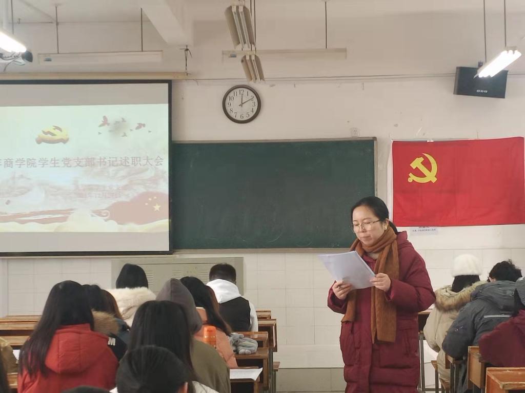 会议第一项,学生党支部书记许炳娜进行述职。许炳娜同志紧扣“改革创新,奋发有为”这一主题,围绕深入贯彻习近平新时代中国特色社会主义思想,深化党史学习教育,推进“两学一做”的学习教育常态化制度化;创新党员实践活动,开展特色活动,引导学生党员加强党性修养与为民情怀;规范党内建设规范、细化支部管理服务、健全工作制度体系等多方面汇报了学生党支部的党建工作。许炳娜同志表示,学生党支部要根据新时期下的新要求与新期望,不断改进提升,增强学生党员素质,加强支部建设。