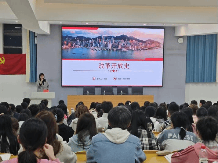 2024年11月5日晚,商学院党委书记邓剑为商学院、初等教育学院分党校入党积极分子讲授了主题为“改革开放史”的党课。