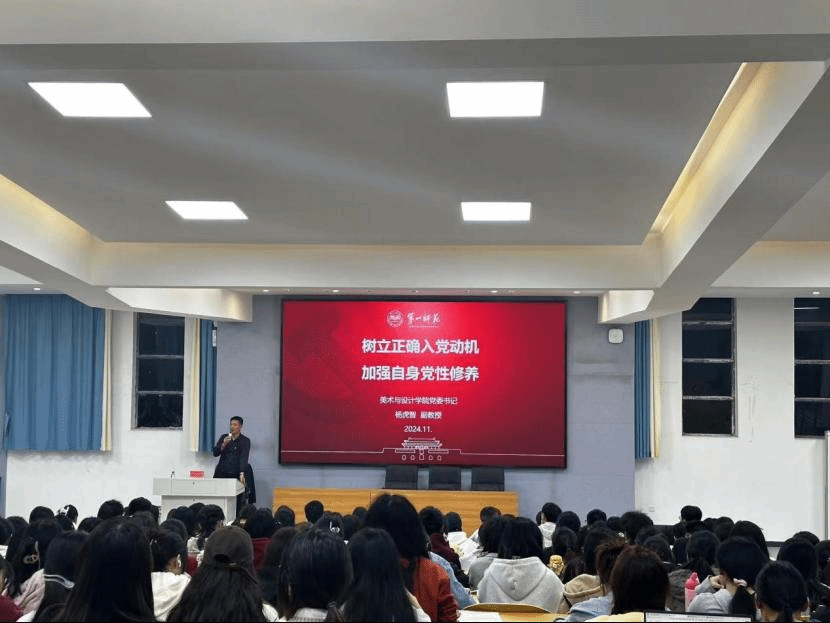 2024年11月6日晚,美术与设计学院党委书记杨虎智为商学院、初等教育学院分党校入党积极分子讲授了主题为“树立正确入党动机,加强自身党性修养”的党课。