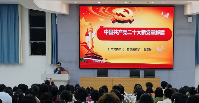 2024年11月13日晚,机关党委书记、党校副校长谢培松为初等教育学院分党校、商学院分党校第二期入党积极分子讲授了主题为“中国共产党二十大新党章解读”的党课。