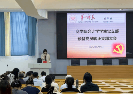 2025年6月4日,商学院学生党支部在玉衡南101召开预备党员转正大会和接收预备党员大会。本次会议旨在严格规范党员发展程序,加强基层党组织建设,为党组织输送新鲜血液。教师党员作为培养联系人与全体预备党员及发展对象共同参加会议,商学院学生党支部书记刘艺主持会议,党委书记邓剑出席并发表讲话。