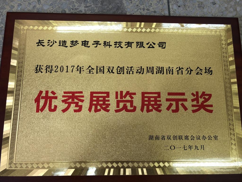 本次双创展示中,我院学生创业项目长沙造梦电子科技有限公司获邀参加并荣获2017年全国双创活动周湖南分会场优秀展览展示奖。该奖项给与了长沙造梦电子科技有限公司对于活动周筹备组织,展览展示以及专题活动的充分肯定。是对长沙造梦电子科技有限公司创新创意的认可和支持,是鼓励其再接再厉的褒奖表彰。会场优秀展览展示奖不仅仅是对于创新创意的认可,更是对长沙造梦电子科技有限公司的员工工作态度的赞扬和欣赏。